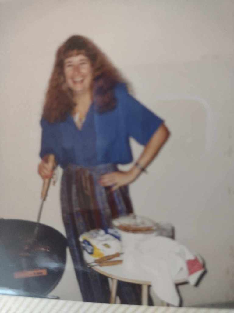 Aquí estoy, en una BBQ, no recuerdo en casa de quién, en 1996 o 97. ¡Ah, el coldwave que me hice a poco de llegar! Parecía un poodle mojado, pero en aquel momento me sentía muy chic.